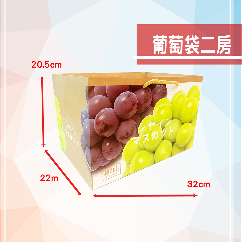 ※品名 :包裝耗材-葡萄袋-2房 ※規格 : 32X22X20.5(CM) ※材質 : PAPER+亮膜 ※入數 : 50pes/件 ※注意事項 : 適用於一房葡萄禮盒,大量採購另有優惠價格。